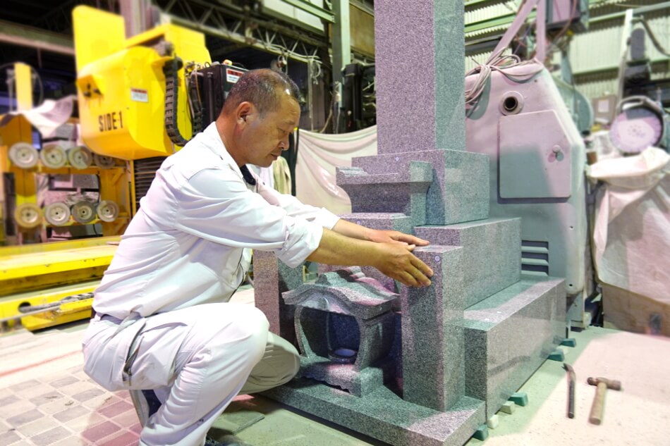 音がしなくなるまで工場内で調整を行った後、実際に墓地でお墓を組み上げて完成、お客様へお引渡しとなります。